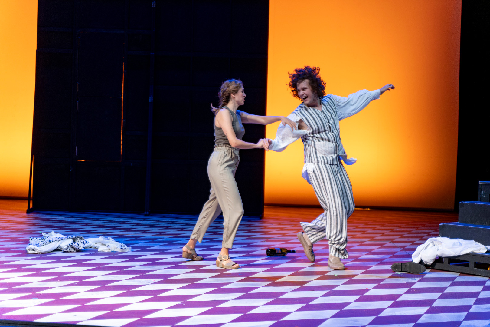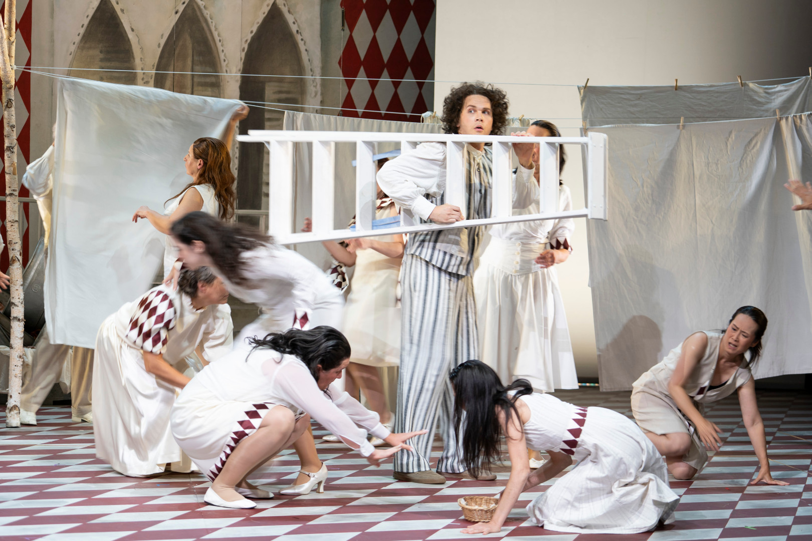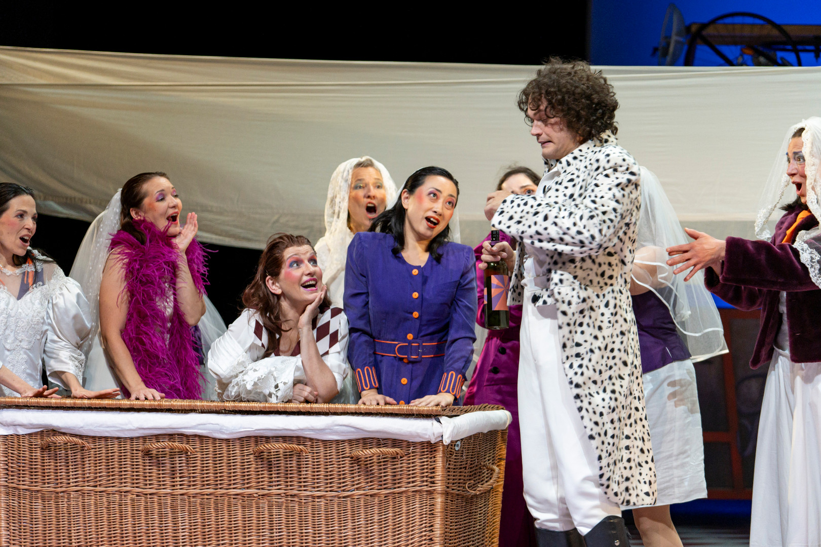 Tamara Heimbrock hat ein Händchen für Kurzweil. Leerlauf gibt es bei ihr nicht. Den Inhalt der Oper peppt sie mit einem steten Fluss an Ideen auf, zeigt Screwball und Comic. Alles fügt sich ins Gesamtkonzept. […] Der Sound atmet südländisches Flair. Die Chemie stimmt auch zwischen den Protagonisten. Alle sind in Spiellaune. Vorn dabei Ferdinand Keller. Mit Talent im humoristischen Fach gesegnet, verkörpert der Tenor den tollpatschigen Bauernbuben Nemorino mit Aplomb. Stimmlich hat Keller zugelegt. Seine Arie „Una furtiva lagrima“ zu Harfe und Fagott bezirzt. […] In der Rolle der Adina steht Sopranistin Julia Araújo bereit, die schon beim letzten Donizetti vor drei Jahren als Caterina Cornaro glänzte. Nun gibt sie im grünen Hosenanzug eine launige Gutsbesitzerin, auf die Nemorino, zu Beginn mit weichen Knien, ein Auge wirft. Mal keck, mal verstimmt, zeigt Araújo Spielwitz, ihr gut austarierter Sopran verfügt über glasklare Spitzen. […] Clarke Ruth im schillernden Quacksalber-Outfit verleiht jenem Liebestrankbereiter Dulcamara Charme. Sein flexibler Bass wird in den richtigen Momenten wohlig tief. Einen Tipp hält er bereit: Wein schütteln und zügig konsumieren, damit der Stoff seine Wirkung entfalten kann. Sora Winkler hat als Bauernmädchen Gianetta bezaubernde Momente. […] Die Mitglieder des Opern- und Extrachors sind mal wieder eine Wucht. […]