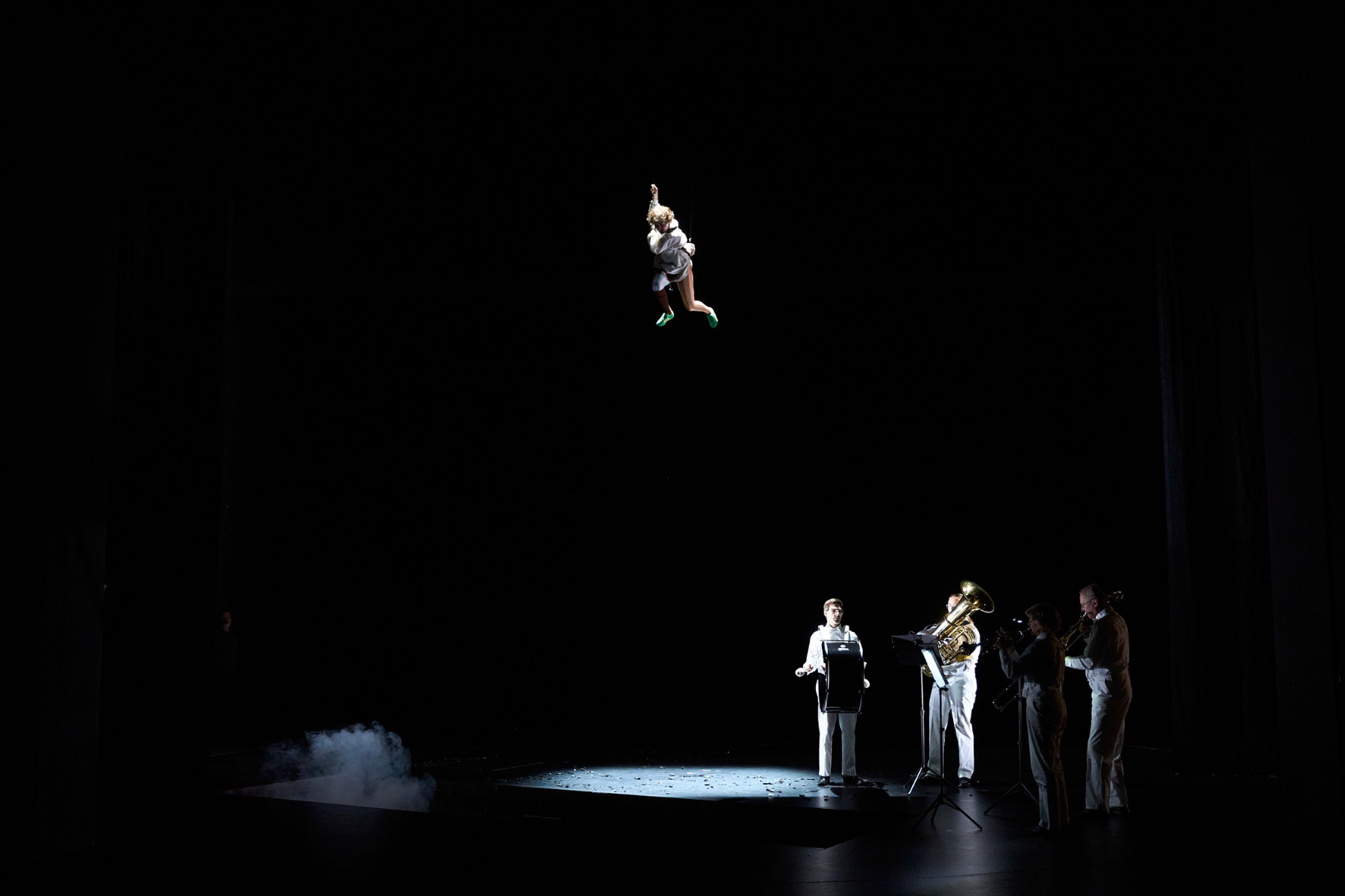 Den Schaubudencharakter verstärkt Ausstatterin Hilke Fomferra mit überdimensionalen blinkenden Pappmaché-Rosen, die links und rechts das Schlachtfeld begrenzen, auf dem am Ende nur eines übrigbleibt: die sichtbare Zerstörung. Durand-Mauptit zieht alle Register ihrer Regiekunst. Es wird bewegt, was bewegt werden kann – das bedeutet höchste Konzentration für die Bühnenarbeiter, die das Gestänge von oben genauso exakt in Gang setzen müssen wie die Drehbühne des Bodens. Ein hübsches Spektakel, bei dem die deutsch-französische Regisseurin geschickt noch eine Blaskapelle zum Einsatz bringt. Vier Musiker an Trommel, Trompete, Tuba und Posaune geben hier den Takt vor und lassen auch bekannte Melodien erklingen.