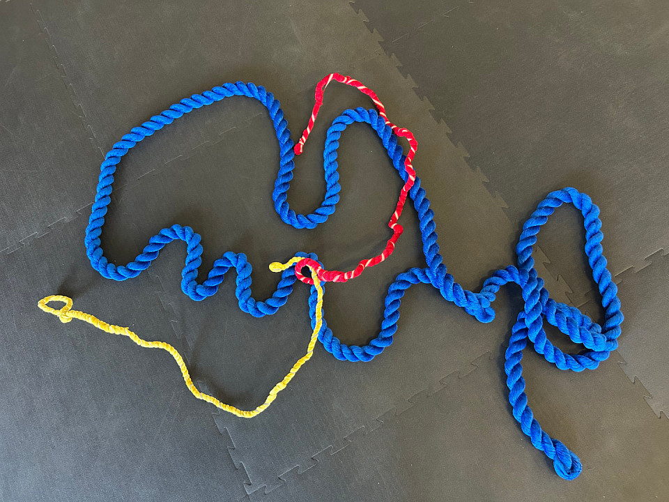 Ein besonderes Element sind dabei bunte Seile aus Stoff und Draht, die auch im Bühnenbild von „Feuerwerkskörper“ vorkommen. Sie können geformt und verwandelt werden, und regen unsere Fantasie an: mal Verbindung zwischen uns, mal Tanzpartner, mal Erweiterung des Körpers. Wir können mit diesen Seilen Bewegungen auf überraschende Weise erleben.