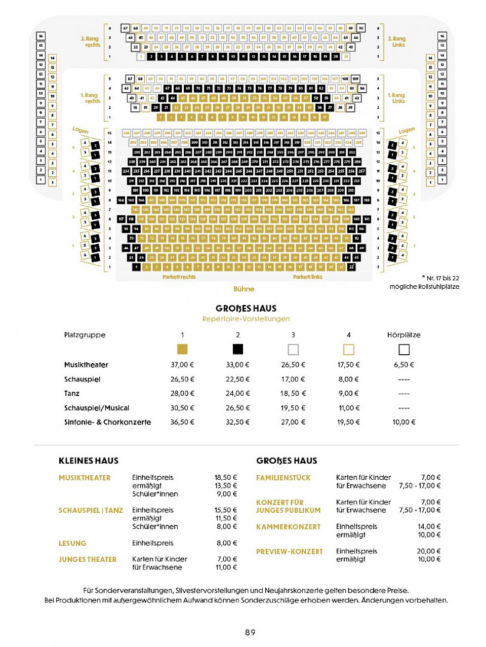 Mit unserer TheaterCard für das Große Haus für 40 Euro können Sie an der Abendkasse eine Stunde vor Vorstellungsbeginn eine Karte für die Hälfte des regulären Tagespreises erhalten. Ausgenommen sind Gastspiele und Sonderveranstaltungen. Ihre Plätze können Sie am Vorstellungstag ab 16:00 Uhr und samstags ab 9:30 Uhr auch telefonisch reservieren.